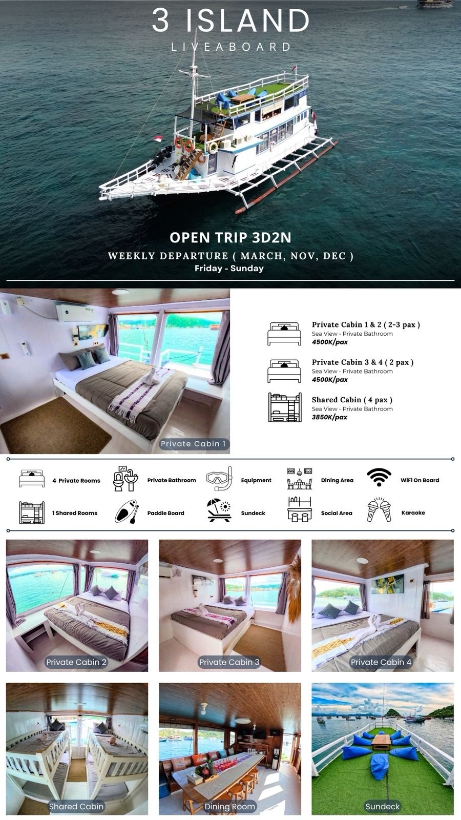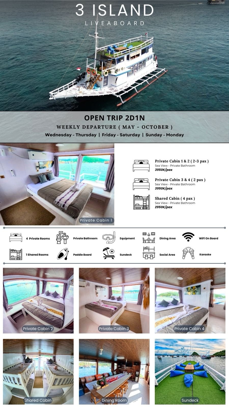 3 Island Liveaboard menghadirkan pengalaman berlayar yang nyaman dan menyenangkan di Labuan Bajo dan Komodo. Dengan kabin sea view ber-AC dan kamar mandi pribadi, kapal ini dirancang untuk memberikan kenyamanan maksimal selama perjalanan. Fasilitas seperti ruang makan yang luas, area santai, sundeck terbuka, serta perlengkapan snorkeling dan WiFi di atas kapal membuat pengalaman semakin lengkap. Didukung oleh kru yang ramah dan profesional, 3 Island Liveaboard menjadi pilihan tepat untuk menikmati keindahan Komodo dengan nyaman dan berkesan.