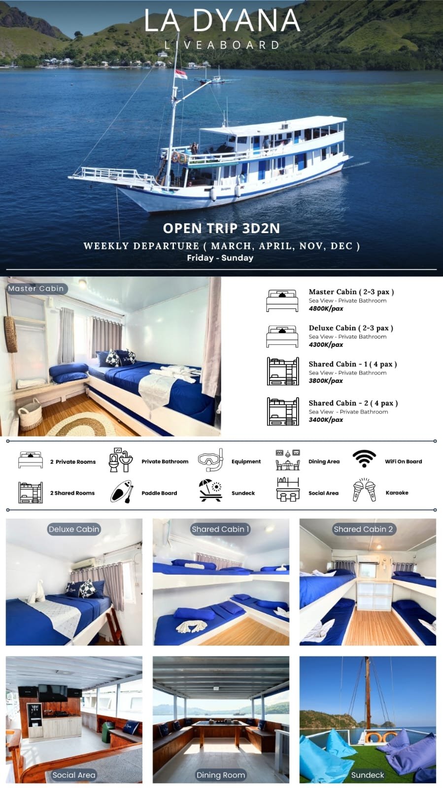 您可以直接聯絡我們查詢 La Dyana Phinisi 開放式行程或私人包船的出發日期、艙位供應情況和價格。